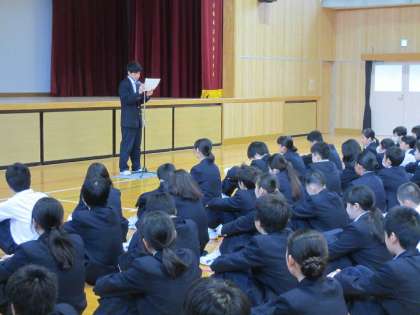 今日1限目に「いじめについて考える日」の取り組みとして、全校集会を行い生徒会代表のアピールと校長の話、その後教室で担任からの話とアンケートを行いました。