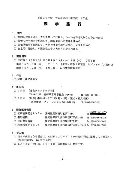 ご家庭においても、今一度荷物の確認をしていただき、集合場所までの交通手段の確認をお願いいたします。