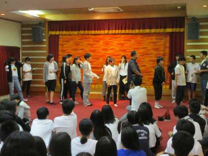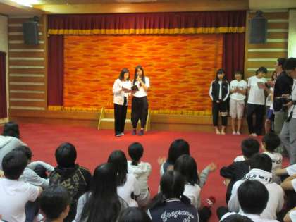 食事の後、同じ大広間でレクリエーション大会を行いました。まずは司会の生徒が大会のスタートを告げ、最初は各クラス10名ずつが参加し、ジェスチャーリレーを行いました。