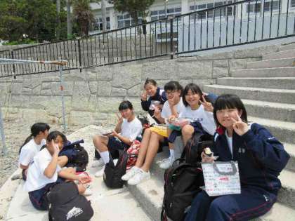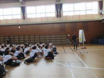 バスに揺られて約2時間30分、自然の家に到着し、目の前の海岸で家から持ってきた弁当を食べました。その後体育館で、担当の方から施設についての説明や寝具のたたみ方などを教えていただきました。