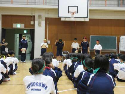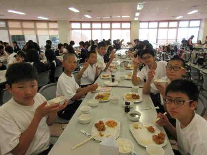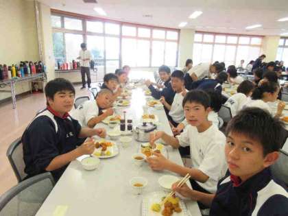 約2時間の海洋体験をが終わり、入浴の後、食堂で夕食を食べました。夕食が終了し、体育館で室内オリンピックを行いました。