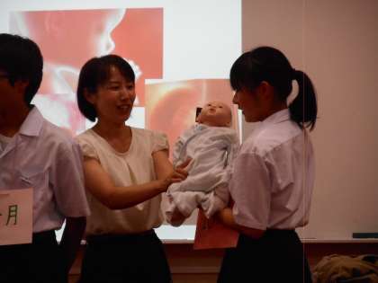 総合医療センターの3人の助産師さんに来ていただき、第1部「生命の誕生」ではおもりの入ったジャケットを身に着け妊婦を実感するという体験をし、生命の尊さについて学びました。第2部「男女交際について」では、同性2人1組になりゲームをしながら、自分にとってのプライベートゾーンを知りました。「自分の身体は自分のもの」「Noと言える勇気」を持ち、自分を大切にすることを学びました。