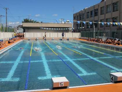 3・4限目に1年生水泳大会を行いました。水泳の得意な生徒も不得手な生徒も、元気いっぱい泳いでいました。