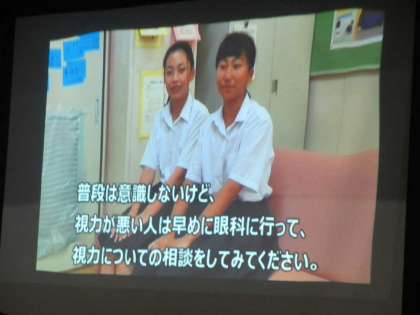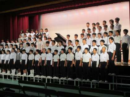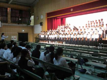 整備委員の発表の最後の場面と1年生の合唱です。途中谷川俊太郎の詩「生きる」を群読しました。力強く堂々とした朗読と息の合った合唱が、1年生らしくこれからの意気込みを感じました。