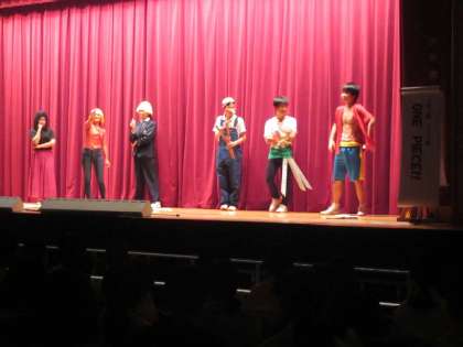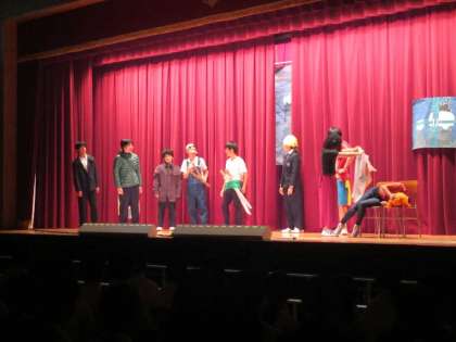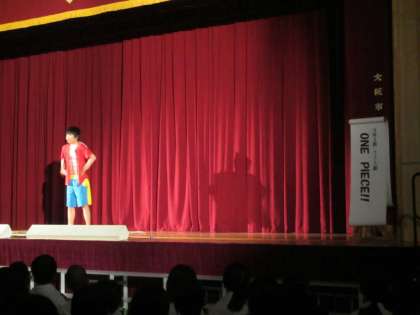 続いて3組は人気漫画「ONE PIECE!!」をみんなで演じました。仲間のナミを助けるために麦わらの一味が旅に出るお話でした。クラスで知恵を出しながら脚本を書きました。