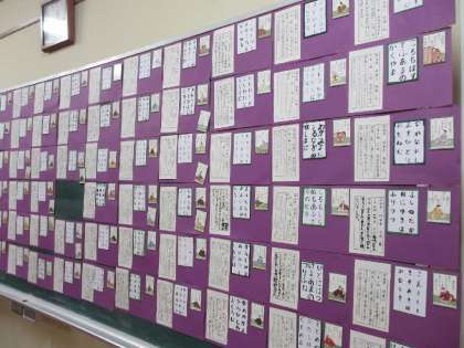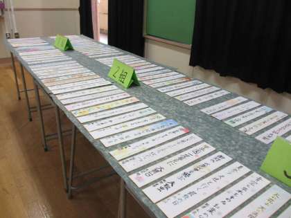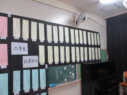 国語科では授業で作成した作品を展示しました。3年生の創作俳句では日常の一こまを題材にしたユニークで楽しい作品があり、思わず笑ってしまう作品もありました。