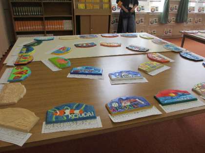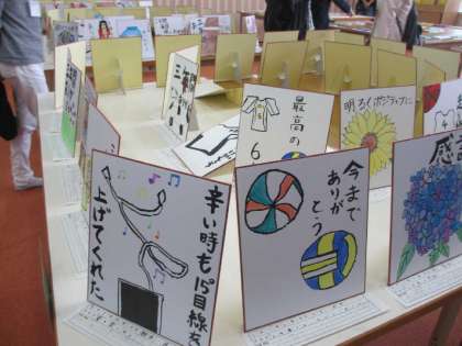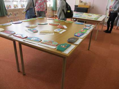 美術科では1年生では基本の色の作り方・塗り方を学習した作品、2年生では木彫りレリーフ作品、3年生では自分や誰かにあてた絵手紙作品を展示しました。
