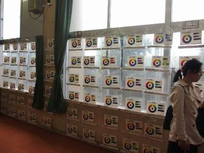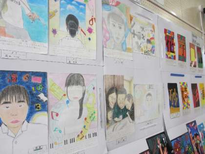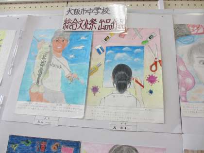 そして、3年生の舞台発表の朗読、合唱の際にスライドで生徒たちの自画像が流されましたが、そのうち優秀作品が大阪市総合文化祭の美術展で大阪市立美術館に展示されました。その優秀作品です。
