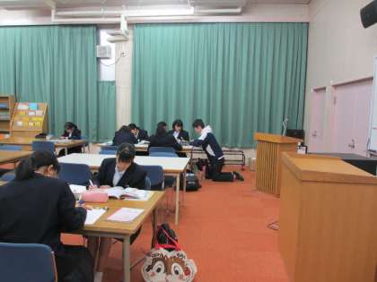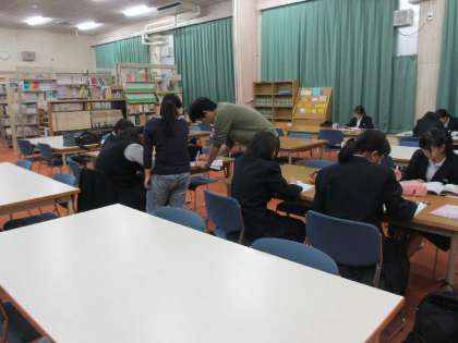 先週15日(木)と今日19日(月)の2日間学校元気アップ支援員の協力を得、図書館でテスト前の自主学習会を行いました。ボランティアとして3名の大学生が参加し、生徒たちの質問に応えてくれていました。ひとりひとり熱心に学習していました。