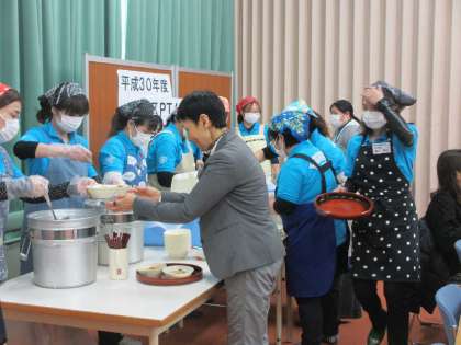 今日、本校図書館で、都島区PTA協議会による給食試食会を行いました。各小中学校のPTAの方々をはじめ、ご来賓として区役所、教育委員会よりご担当様、また大東地区、淀川地区の連合町会様、市議会議員の方々にも出席いただきました。