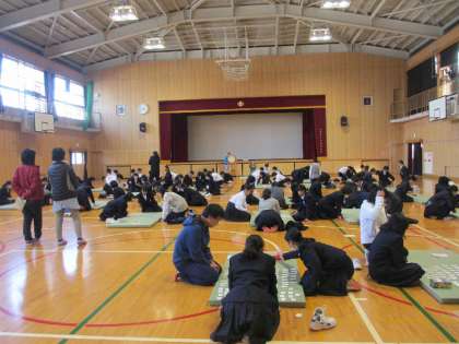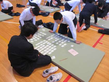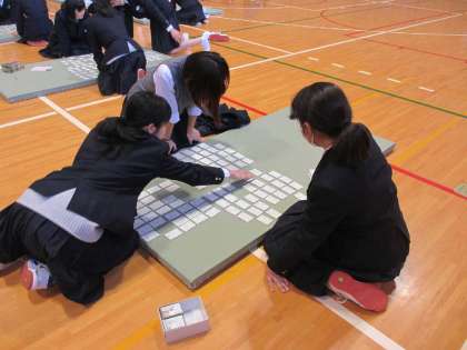 今日、5・6限目体育館で1年生が百人一首大会を行っていました。太鼓の音とともに先生が歌を詠み、生徒が札を取り合っていました。