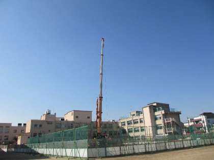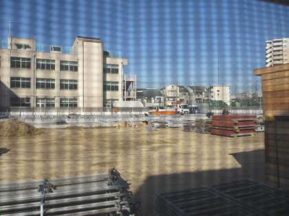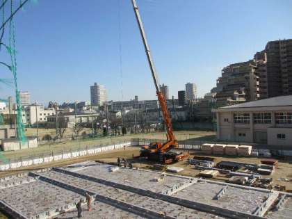 グランドに目を向けると大きなクレーンが仕事をしていました。大きなコンクリート板や鉄骨をワイヤーでぶら下げていました。