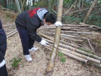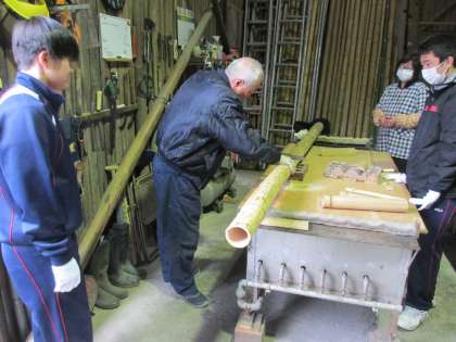 職場体験学習4 公開日 2019/02/20 更新日 2019/02/20 お知らせ 竹材店では竹を削ったりしました。2日目は京都で竹を育てて、竹材を制作しておられる方を訪問し、竹材となるまでの過程の説明をお聞きし、実際に竹を切らせて頂いたり、竹を火あぶって油を抜く作業を体験させていただきました。