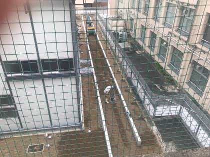 仮校舎の工事が始まってから1か月以上が建ち、建物はすでにできあがり、今は内装、外回りの渡り廊下の工事が進められています。