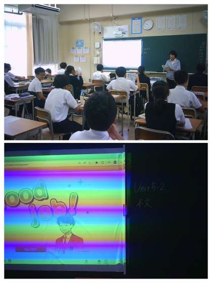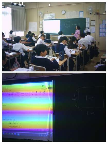 *2年生教室のプロジェクターは今年度、最新式のものに変えました。光量が強く後ろの席から見やすいのですが、写真撮影の際はどうしてもレインボーノイズが生じます。教室では白色に見えるのですが…
