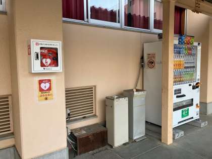 今までは保健室前に1台しかありませんでしたが、先日、2台目のAEDを体育館前の自動販売機の横に設置しました。