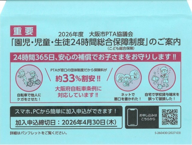 大阪市PTA協議会からの「こども総合保険」のご案内です。