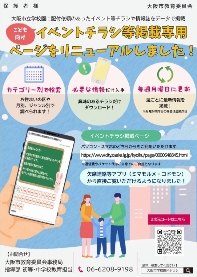 大阪市立の学校では、令和7年7月より、団体等から配付依頼のあったイベント等のチラシや情報誌等の個別配付を取りやめ、データによる掲載へ移行したところでございますが、このたび、保護者の皆様により便利に活用いただくため「チラシ等掲載専用ページ」をリニューアルいたしました。