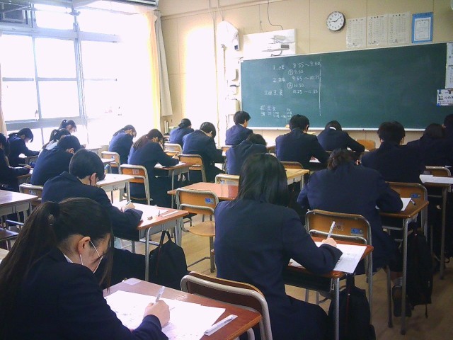写真は1限の2年1組(数学)と2年2組(国語)の様子です。