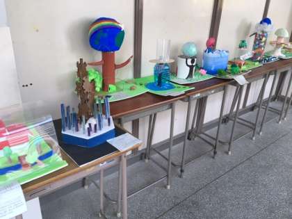 美術室前には、昨年度末に現3年生がグループごとに作成した「万博パビリオン」が並べられています。