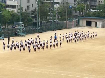 1年生の体育の授業では、グラウンドで基礎体育の授業をしています。バックには、家庭訪問期間で下校する友渕小学校の子どもたちがたくさん見えます。