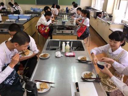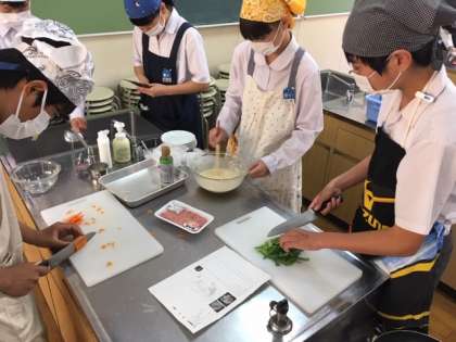 廊下を歩いていると、ゴマ油のいい匂いが漂っていたので、調理室を覗くと3年生が調理実習をしていました。