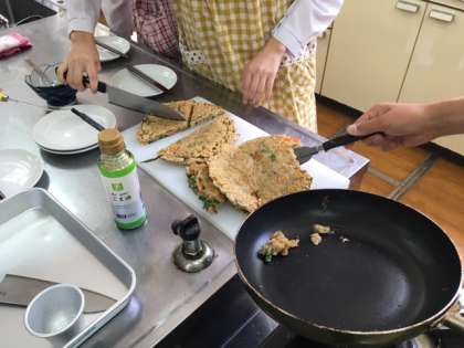 出来栄えは、普段見るチヂミより少しボリュームがありますが、どの生徒も「おいしい〜!」と笑顔でした。