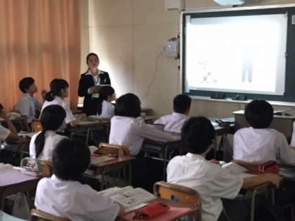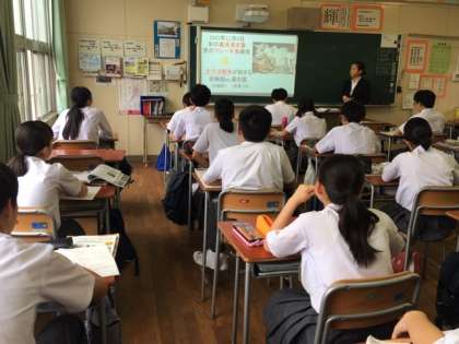 在籍する大学の教官も来られて、沢山の先生に見られながらの授業は、とても緊張すると思います。授業の中身は、映像やグループワークを取り入れたりして、工夫が見られます。新鮮さに包まれた授業でした。
