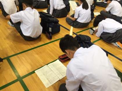 5時間めは、体育館で事前指導です。2日間の日程について、一つずつ確認していきます。その都度、「その時に自分がすべき事をしっかりわかって自分で行動する」ということが、この行事の大きな目的の一つでもあります。