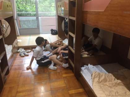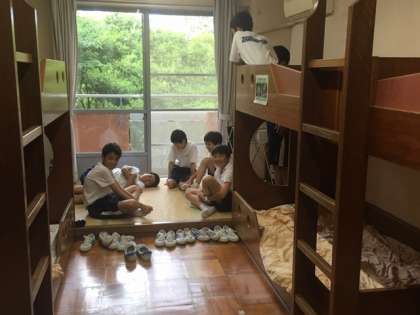 入浴タイムの後、夕食まではくつろぎタイムです。入浴が予想より随分と早く済んだので、各部屋でワイワイと楽しんでいます。
