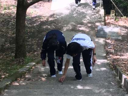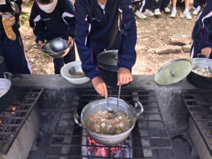 ようやく味噌投入!の班もあれば、鍋がなかなか煮立たず、薪も尽きてきて、火にくべる木っ端を拾い集める班も。