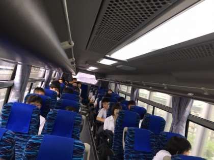 車内では、生徒のみんなが用意してきたCDをガイドさんにかけてもらって、お菓子を食べながら、ご機嫌で過ごしています。高速道路なので、全員シートベルトの着用で、騒ぎながらですが座席は動けません!