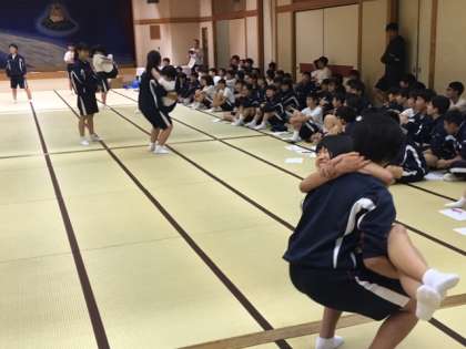 第2ゲームは、「美女と野獣」。1人が1人を抱っこし続けるゲームです。最初は女子から。なかなか決着がつかないので、スクワットします。それでも決着つかないのでジャンプしました。