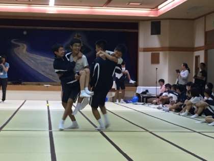男子は、最初からスクワットでしたが、決着つかず、ジャンプ。けど、全く決着つかず、最終的に、互いに邪魔していいことに。騎馬戦状態になりました。すぐに決着つきました!