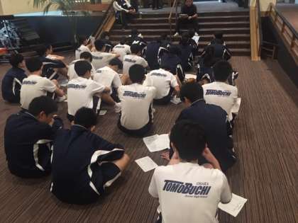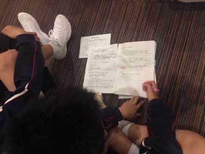 今日の予定を全て終了した後、今日の振り返りと明日に向けて、ロビーで班長会議をしました。