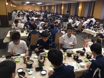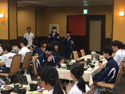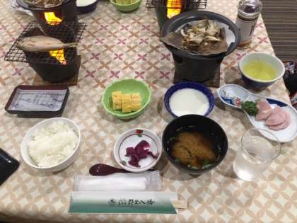 食事係の挨拶と「いただきます」で、爽やかな朝食が始まりました。献立は、朴葉味噌、