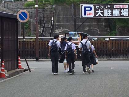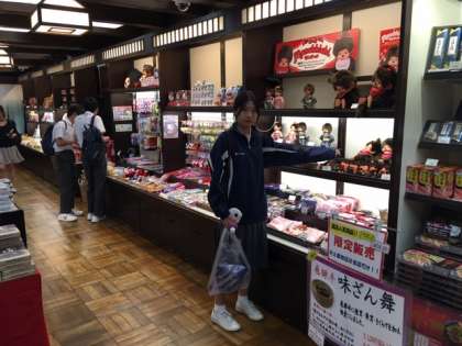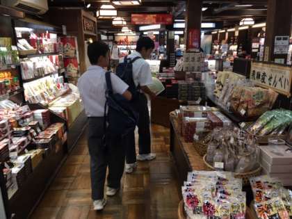 お土産屋さんがたくさんあります。店内に入っても迷い過ぎるほどの品物で、生徒たちは迷いまくっています。
