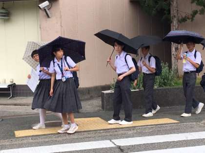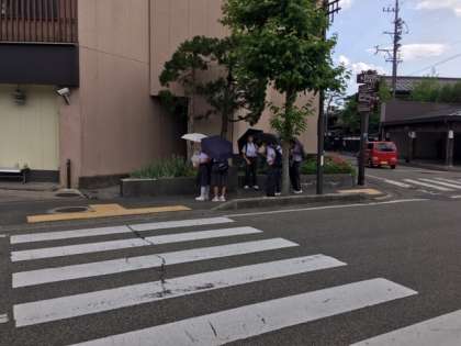 急に大粒の雨が降ってきました。昨夜の天気予報で、夕方に高山市内で雨となっていたので、生徒たちには連絡済みで、みんな傘を持ってました。