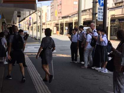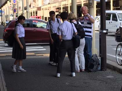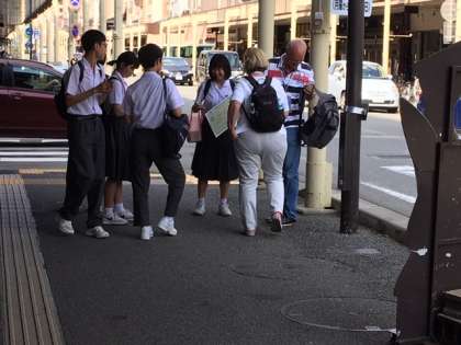 集合場所に向かう途中、外国人と談笑するのは、えっ、うちの生徒やないですか!