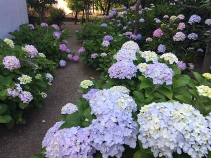 梅雨入り宣言など関係なく、校庭のアジサイは満開です。これから約ひと月間、綺麗な色で魅了させてくれます。