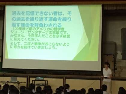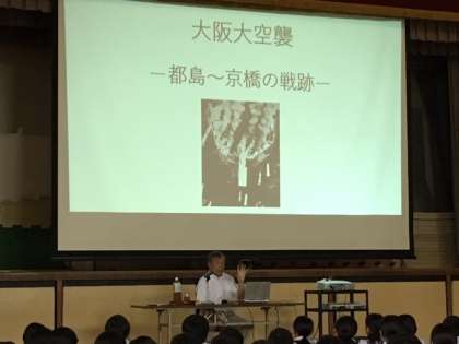 午後、1年生は平和学習を行いました。5時間めは全員で戦争について学んだ後、戦跡の研究をされておられる方から、都島区の戦争被害について詳しく語っていただきました。生徒たちは、全員、しっかりと話を聴いていました。