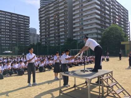 今朝の全校集会で陸上部の賞状の伝達を行いました。