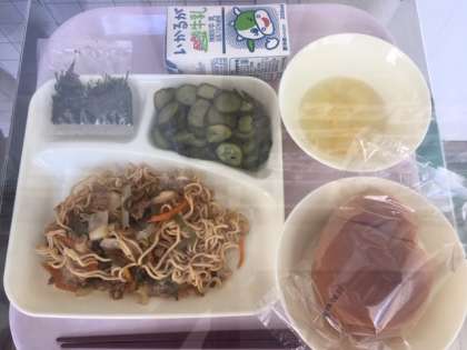 今日の給食献立は、焼きそば・きゅうりの甘酢づけ・洋なし・黒糖パン・牛乳です。