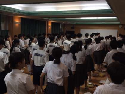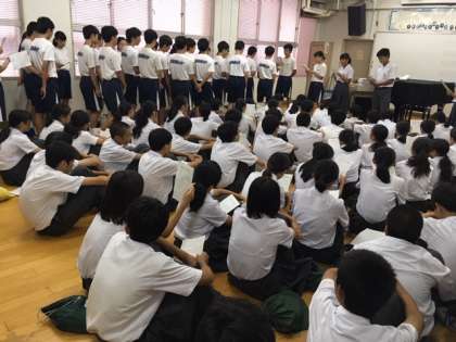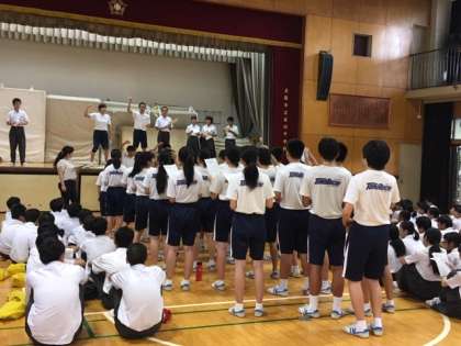 体育大会では、色団ごとに応援合戦を繰り広げます。その全体練習が今日から始まりました。6時間め、黄・青・赤・緑・オレンジのそれぞれ団ごとに分かれて練習しました。 今日は最初なので、歌の練習からです。振り付けはこれから。大きな声が出ていました。楽しそうな感じです。