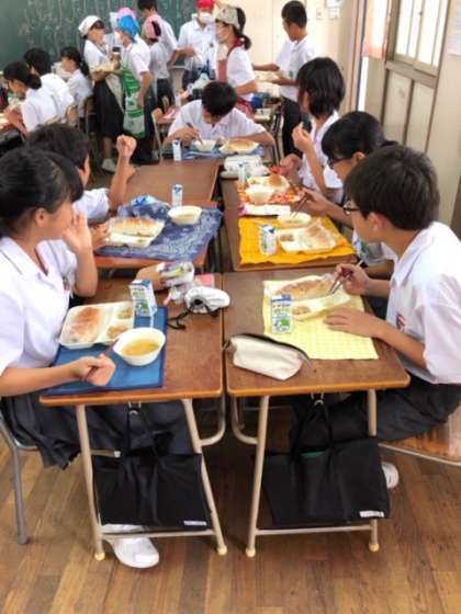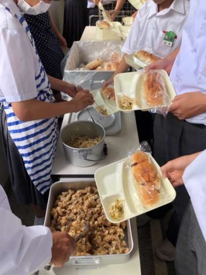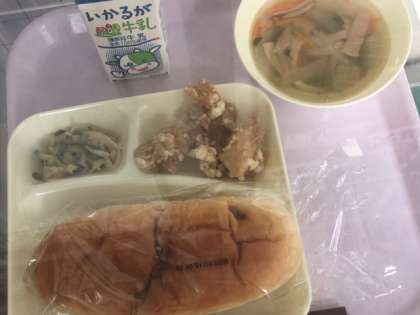 今日の給食献立は、鶏肉のからあげ・切干しだいこんのごま辛みづけ・とうがんの中華スープ・レーズンパン・牛乳です。