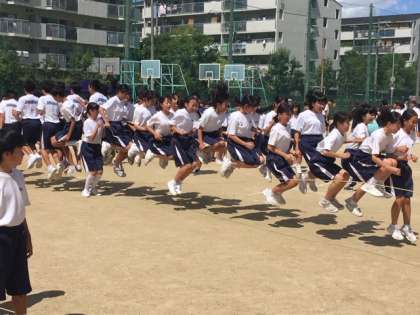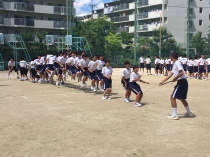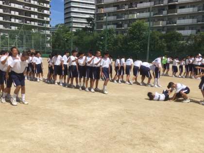 3・4時間めは、1年生の学年練習です。学年種目は、これも恒例のムカデ競争です。 生徒に聞くと、小学校では全員での長縄跳びもムカデ競争もしていないようで、みんな初めての体験です。どちらもなかなか、上手くいきません。