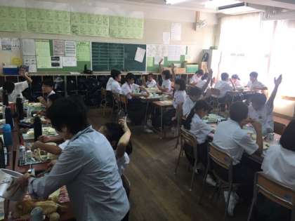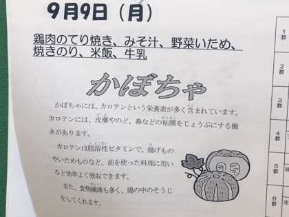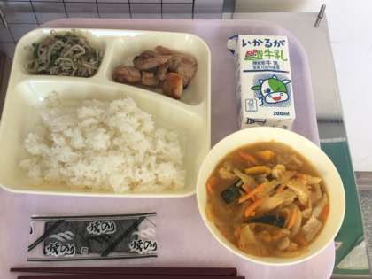 今日の給食献立は、ご飯・鶏肉の照り焼き・野菜炒め・焼きのり・かぼちゃのみそ汁・牛乳です。