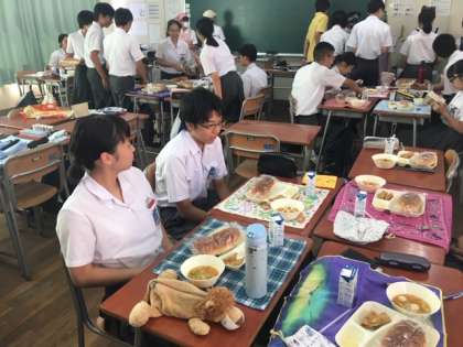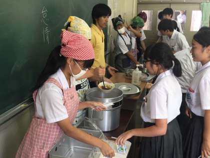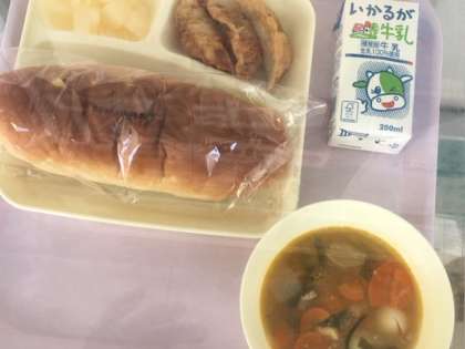 今日の給食献立は、おさつパン・揚げ餃子・中華煮・和梨です。