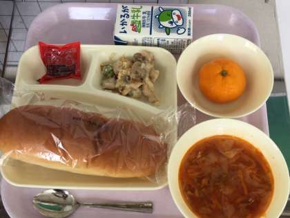 今日の給食献立は、コッペパン・イチゴジャム・豆乳マカロニグラタン・トマトスープ・冷凍みかん・牛乳です。