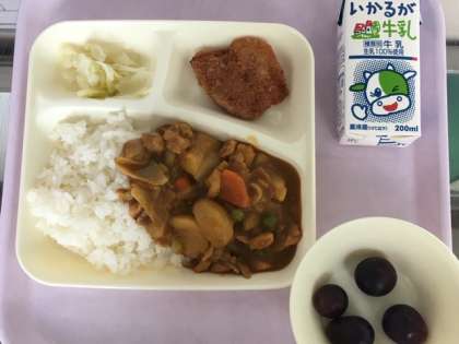今日の給食献立は、チキンカレーライス・一口ヒレカツ・キャベツのピクルク・ぶどう(巨峰)・牛乳です。